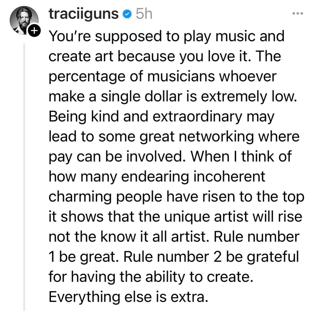 L.A. Guns founder, lead guitarist and chief songwriter Tracii Guns has weighed in with the following: “You’re supposed to play music and create art because you love it. The percentage of musicians (whoever) that make a single dollar is very low. Being kind and extraordinary may lead to some great networking where pay can be involved. When I think of how many endearing incoherent charming people have risen to the top it shows that the unique artist will rise not the know it all artist.”