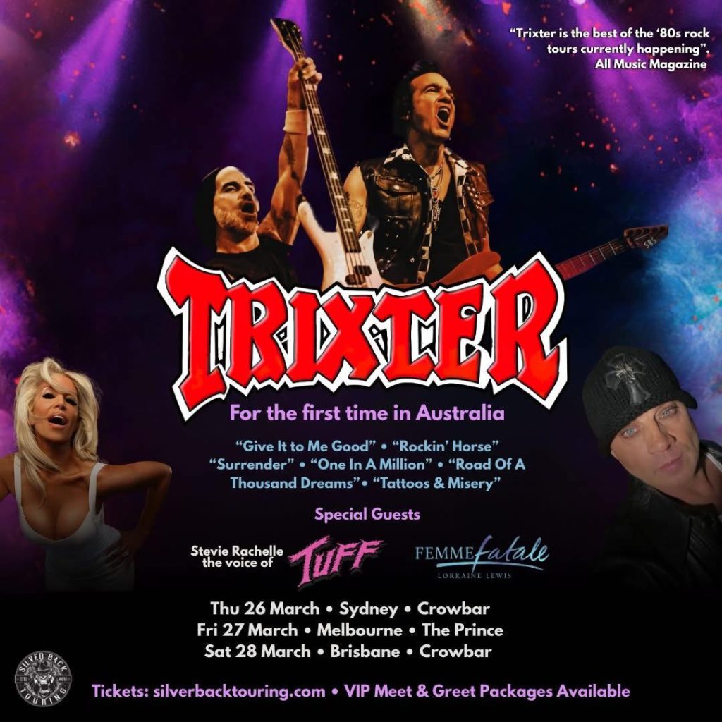 The mighty Trixter from Paramus New Jersey U.S.A. will tour Australia for the first time ever along with Stevie Rachelle the voice of Tuff, and Lorraine Lewis of Femme Fatale.