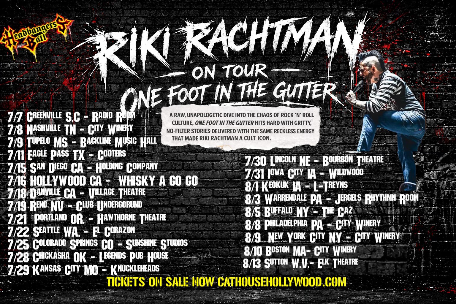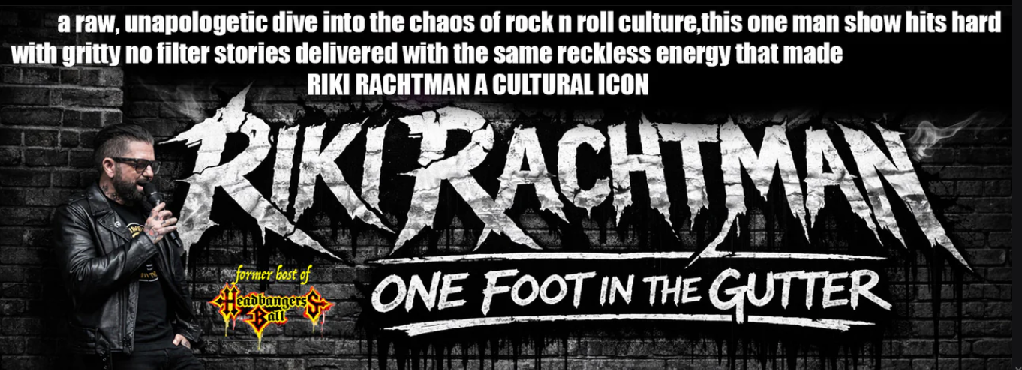 “Riki Rachtman’s One Foot In The Gutter is a highly praised, intimate, and uncensored one-man storytelling show, described as a “back-alley confessional” rather than a standard celebrity highlight reel. It delivers hilarious,, emotional stories covering the Sunset Strip, Cathouse, and Headbangers Ball eras, earning reviews for being “inspirational” and raw.”