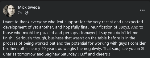Sweda continued: “Seriously though, business that wasn’t on the table before is in the process of being worked out and the potential for working with guys I consider brothers after nearly 40 years outweighs the negativity. That said, see you in St. Charles tomorrow and Saginaw Saturday!! Luff and cheers!!”