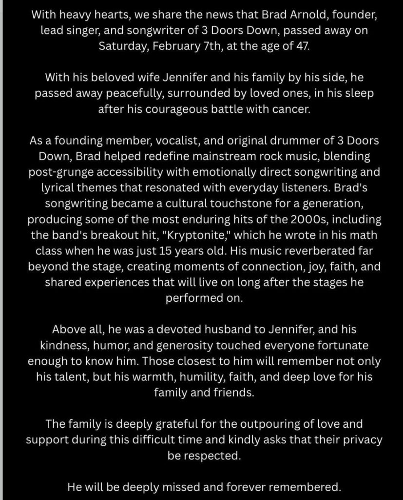 “With heavy hearts, we share the news that Brad Arnold, founder, lead singer, and songwriter of 3 DOORS DOWN, passed away on Saturday, February 7th, at the age of 47.”