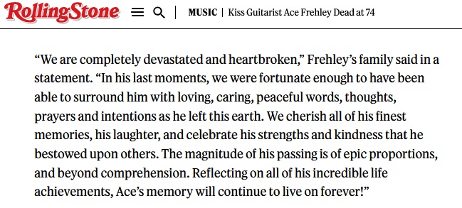 “We are completely devastated and heartbroken,” Frehley’s family said in a statement. “In his last moments, we were fortunate enough to have been able to surround him with loving, caring, peaceful words, thoughts, prayers and intentions as he left this earth. We cherish all of his finest memories, his laughter, and celebrate his strengths and kindness that he bestowed upon others. The magnitude of his passing is of epic proportions, and beyond comprehension. Reflecting on all of his incredible life achievements, Ace’s memory will continue to live on forever!” – source Rolling Stone