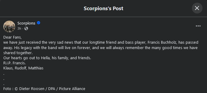 SCORPIONS have posted a message on their official social media earlier today sharing the sad news.