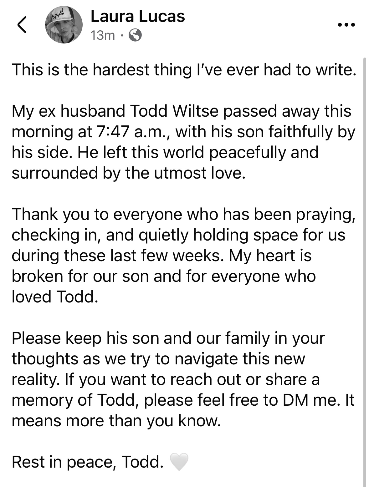 My ex husband Todd Wiltse passed away this morning at 7:47 a.m., with his son faithfully by his side. He left this world peacefully and surrounded by the utmost love.