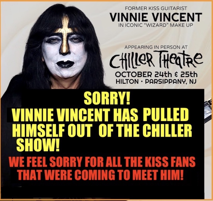 The ‘Chiller Theater’ posted an announcement on their official Facebook page on Tuesday September 30th stating; “SORRY! VINNIE VINCENT HAS PULLED HIMSELF OUT OF THE CHILLER SHOW!”