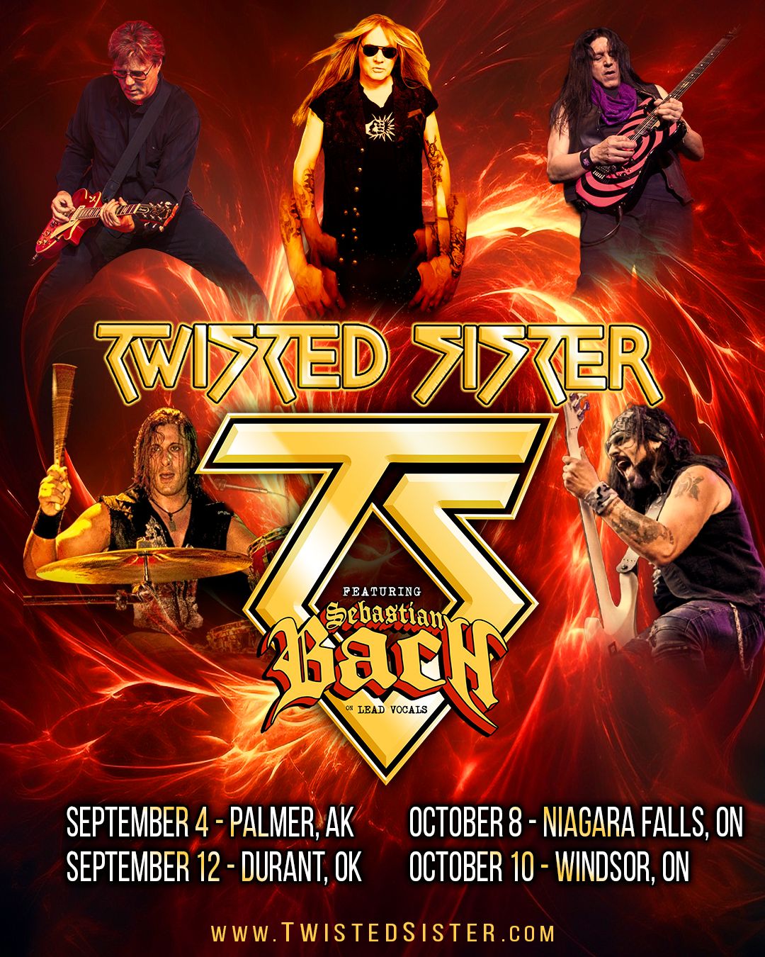 Twisted Sister will play a pair of shows in early September in Alaska and Oklahoma in the U.S., along with a pair of shows in early October in Niagara Falls Ontario and Windsor Ontario up in Canada.